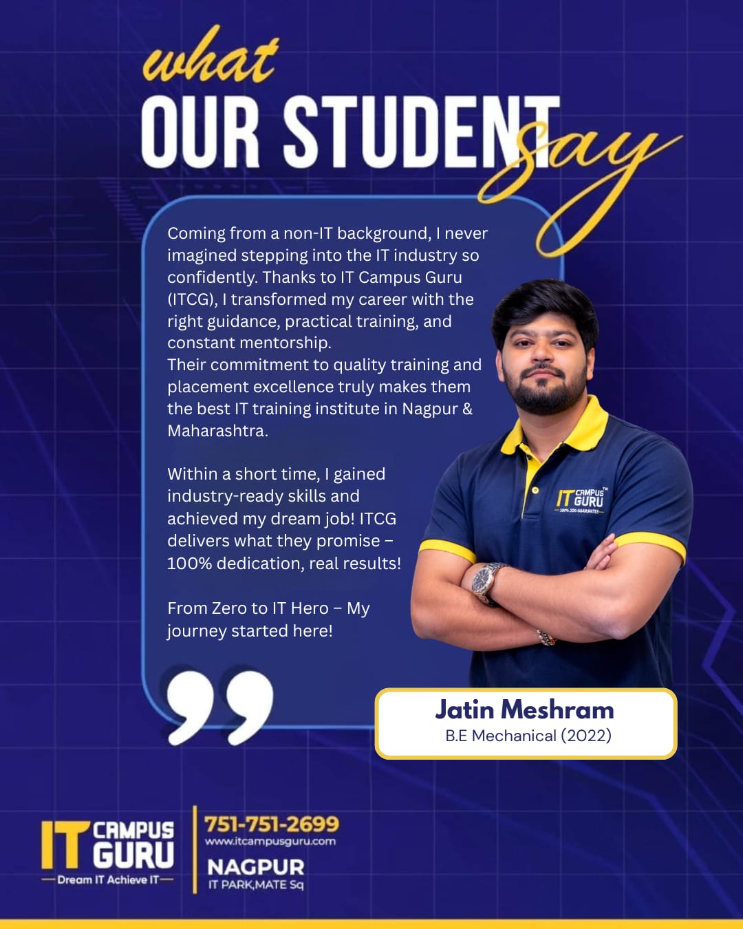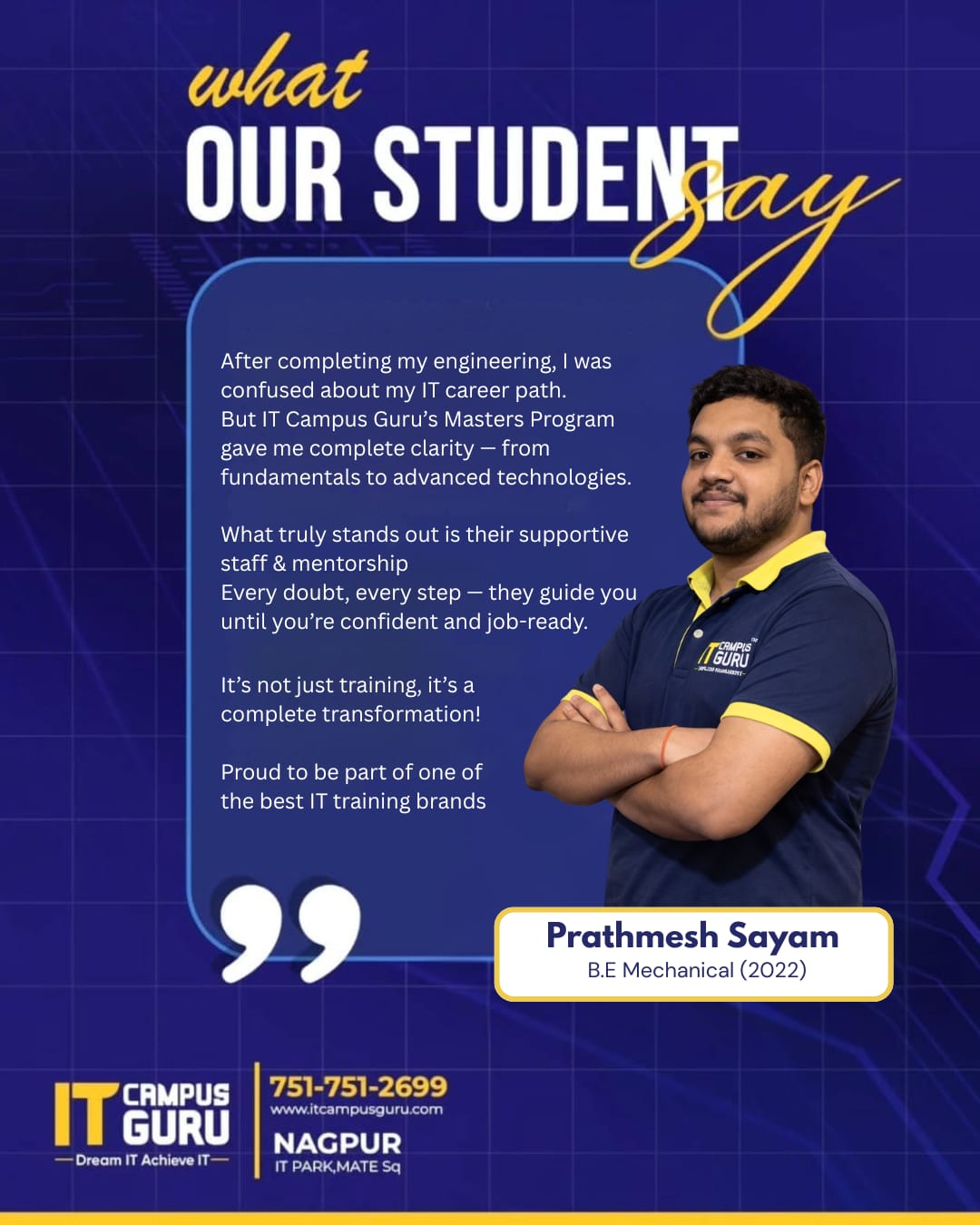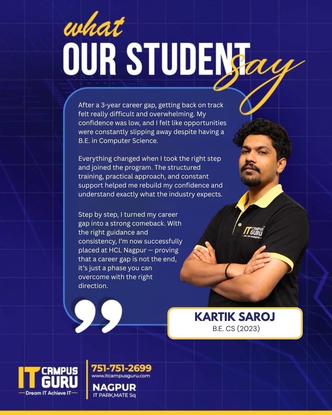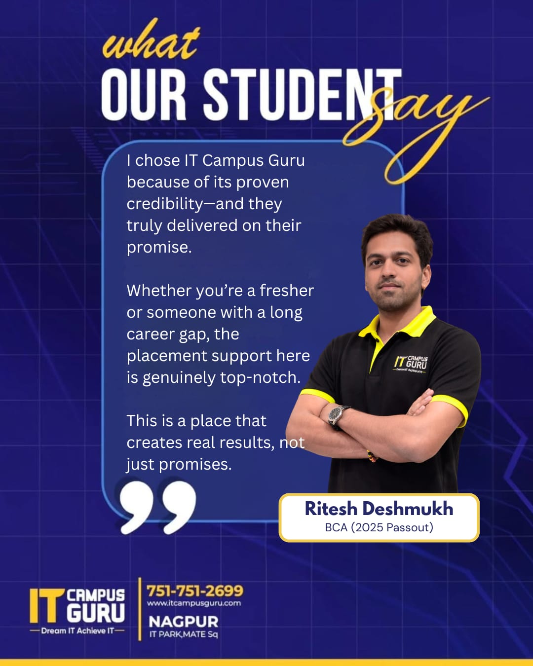 "Choosing IT Campus Guru has been one of the most rewarding decisions for my career. The institute's well-structured courses, expert mentorship, and practical, hands-on training have equipped me with the technical skills and confidence necessary to thrive in the IT industry. What sets IT Campus Guru apart is their 100% job placement guarantee*, which isn't just a promise-it's a commitment they deliver on through outstanding support and guidance."