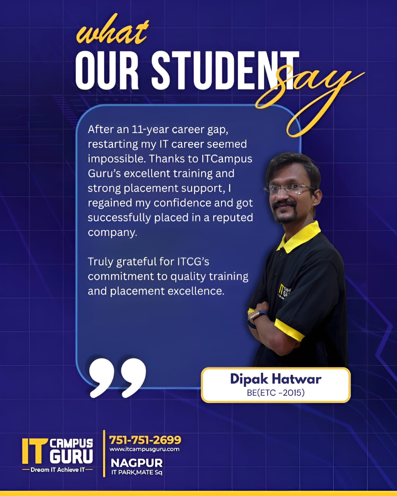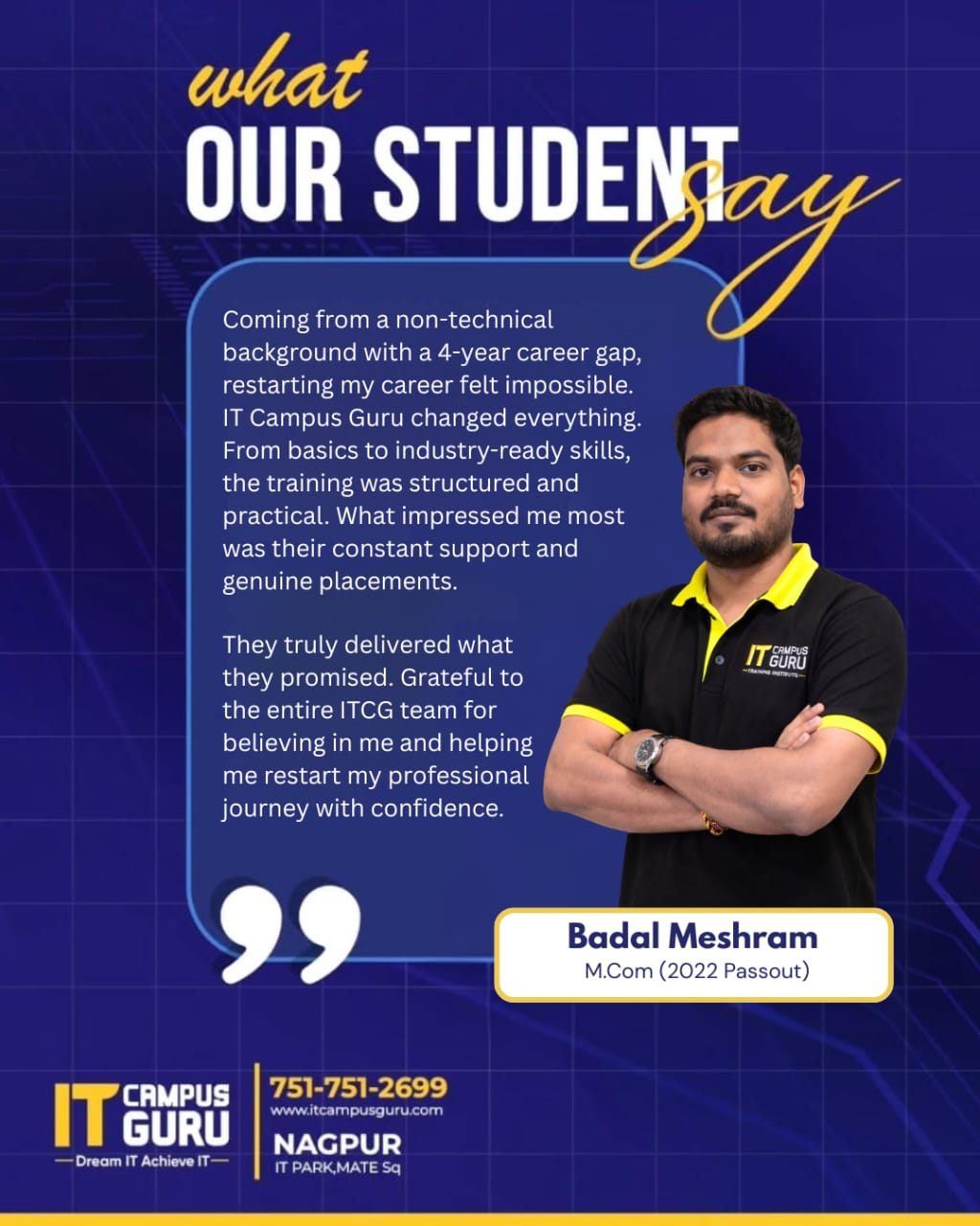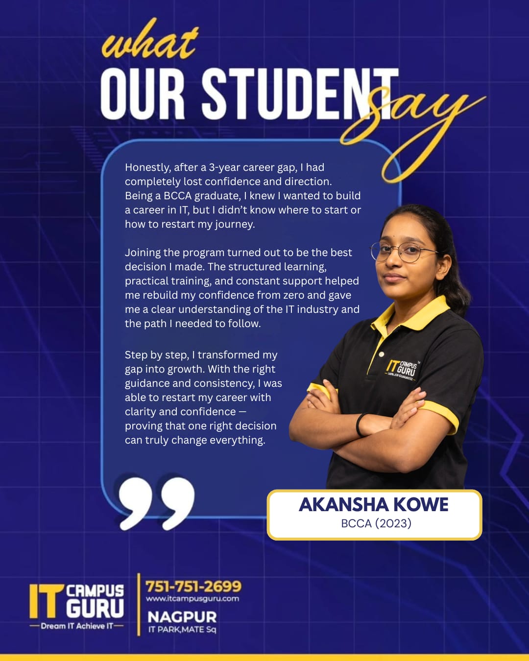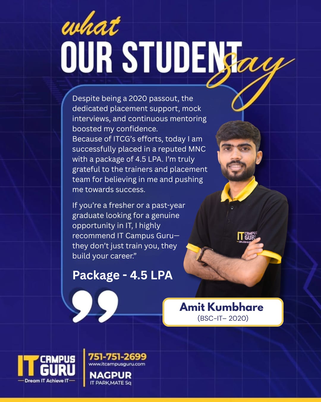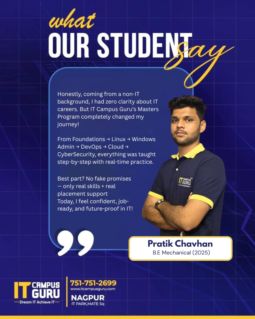 "Choosing IT Campus Guru has been one of the most rewarding decisions for my career. The institute's well-structured courses, expert mentorship, and practical, hands-on training have equipped me with the technical skills and confidence necessary to thrive in the IT industry. What sets IT Campus Guru apart is their 100% job placement guarantee*, which isn't just a promise-it's a commitment they deliver on through outstanding support and guidance."